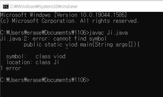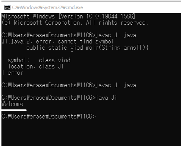 오류를 고치고 다시 컴파일 명령어 javac 파일명. java 작성 후 오류가 없다면,