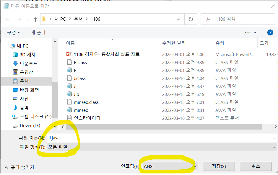 파일명 뒤에. java를 붙이고, 파일 형식은 text에서 모든 파일로 바꾼 후 인코딩은